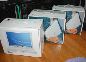 iBookはこのデザインになってから4代目のモデルなんだけど、4代目でようやく箱のデザインが変わったよ。ちなみに真ん中のはちょっと前まで使っていた3代目iBookの箱(もちろん中身は売っちゃった)。右のは1代目iBookの箱(中身は姉が使用中)。