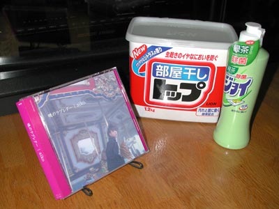 (後ろの「部屋干しトップ」と「ジョイ」は宴会でもらったベタな景品…)