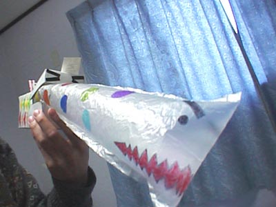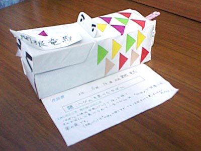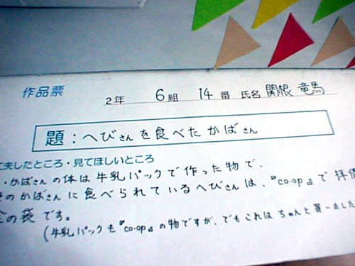 工夫したところ・見てほしいところ:かばさんの体は牛乳パックで作った物で、そのかばさんに食べられているへびさんは「co-op」で拝借した傘の袋です。(牛乳パックも「co-op」の物ですが、でもこれはちゃんと買いました。)