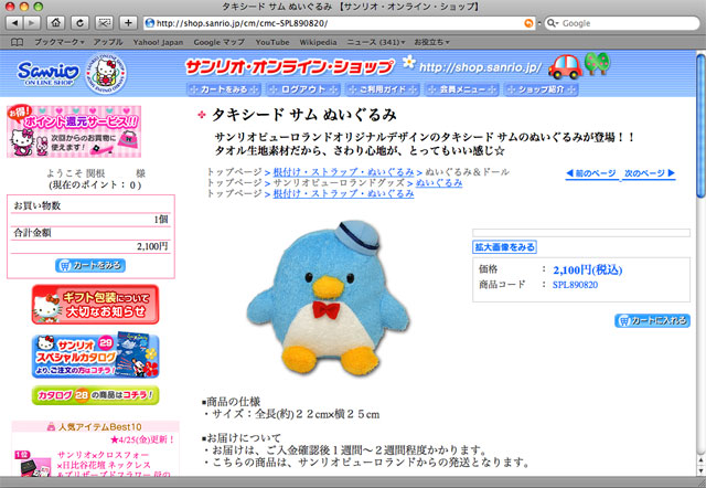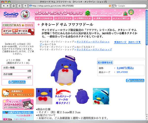 ↑また売ってるじゃないか!!!(サンリオ・オンライン・ショップ「タキシードサム ぬいぐるみ」)
