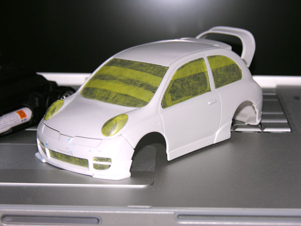 実は窓の部分をマスキングしたのですが、スプレーのシンナーがマスキングテープにしみてしまって