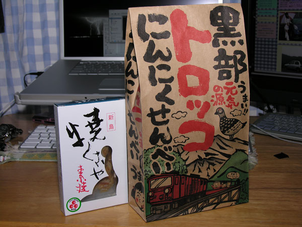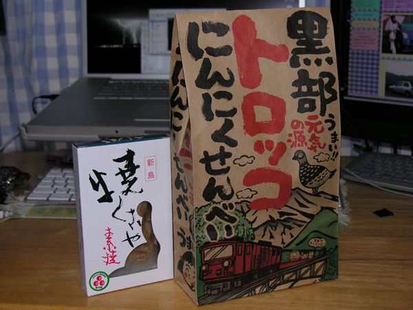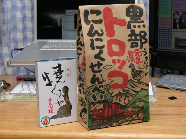 「黒部うまい!!元気の源トロッコにんにくせんべい」の左側面に光が当たっているのが分かるかと思います(名前長っ!)。