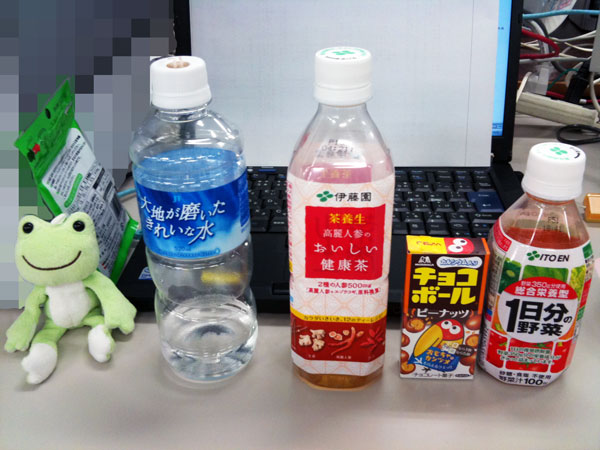↑左から朝買った「水」、お昼に買った「高麗人参のおいしい健康茶」と「チョコボール」、夕方に買った「野菜ジュース」(こんぶも)。