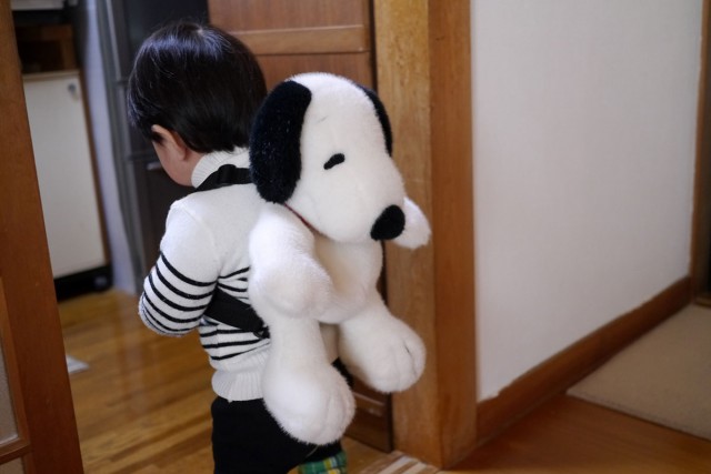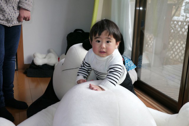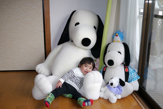 ↑お子さまは大きなスヌーピーに会えて嬉しかったようで、自分からスヌーピーの横に座ったり