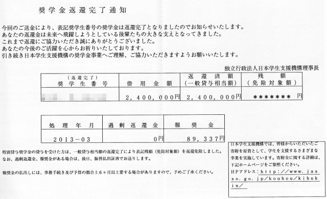 一括繰上げ返済すれば利息分がある程度戻ってくるとか、奨学生が少しでも希望を持てて、一生懸命働いて返済しようと思える環境を作って欲しいなと個人的に願っています。