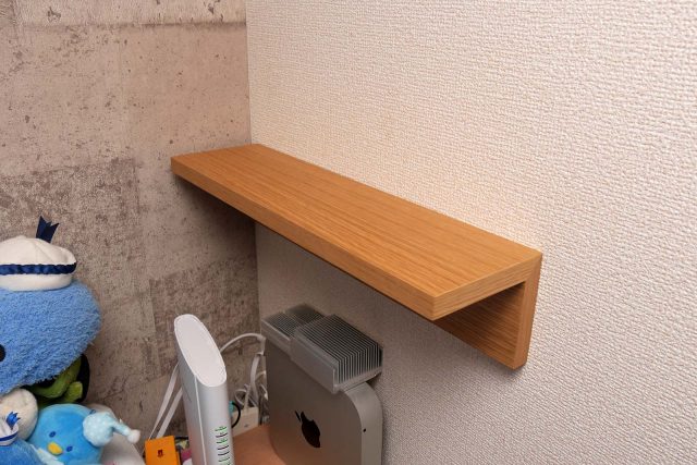↑今回設置した棚は「幅44cm、奥行12cm」のちょっとしたスペースなのですが、今まで机の上に置いていた小物や荷物をこの棚の上に置いてみたところ、思った以上に「机の上のスペース」が広がって机での作業がとても快適になりました(そもそも机の上に物を置き過ぎなだけって話もありますが・・・)。