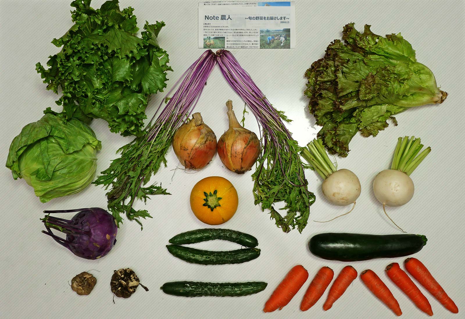 ・コカブ ・新玉ねぎ ・ズッキーニ ・コールラビ ・キュウリ ・藤色水菜 ・キャベツ ・玉レタス ・人参 ・にんにく ・サニーレタス ・丸ズッキーニ