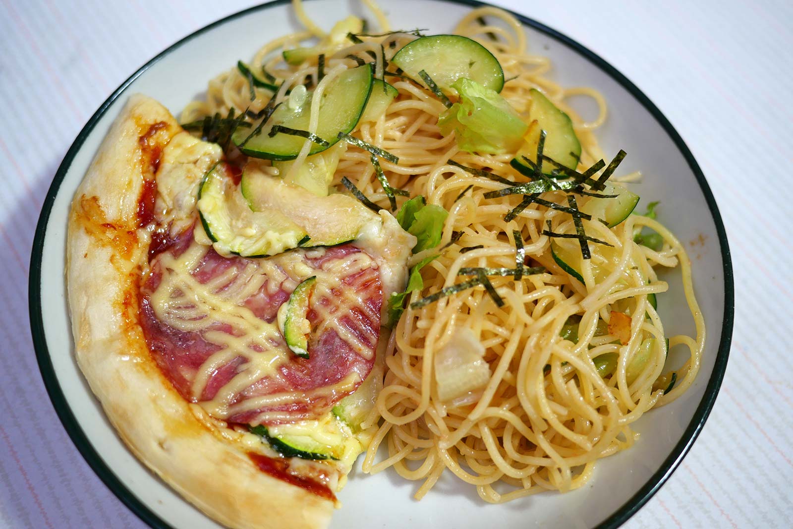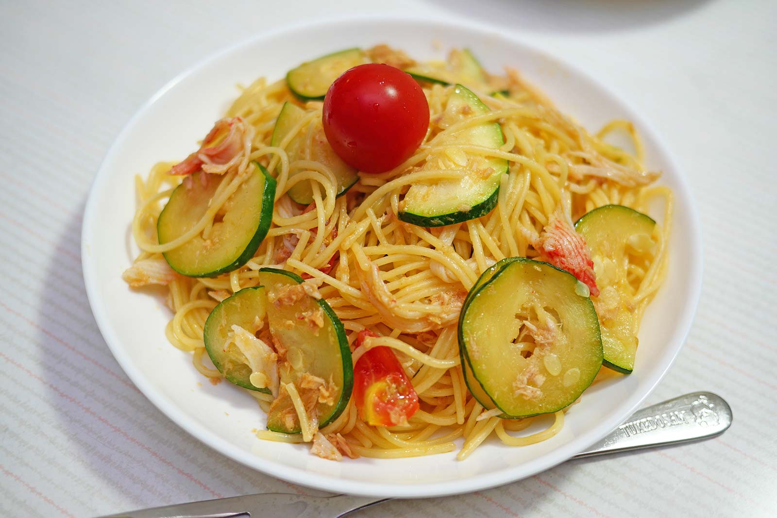↑「ズッキーニのパスタ(ツナとカニカマ入り)」。