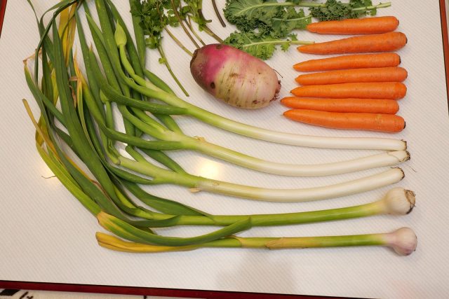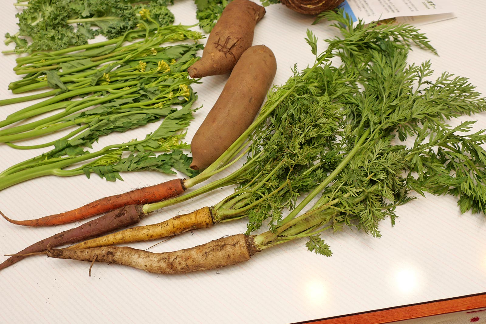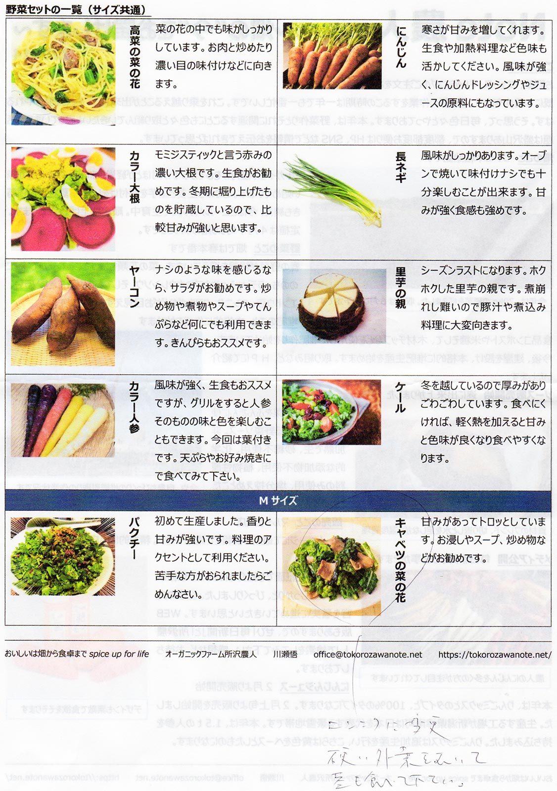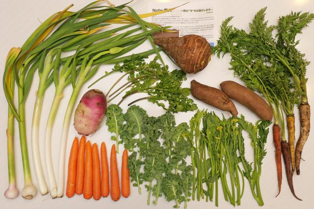 ・高菜の菜の花 ・にんじん ・カラー大根 ・長ネギ ・ヤーコン ・里芋の親 ・カラー人参 ・ケール ・パクチー ・ニンニク(キャベツ菜の花から変更とのこと)