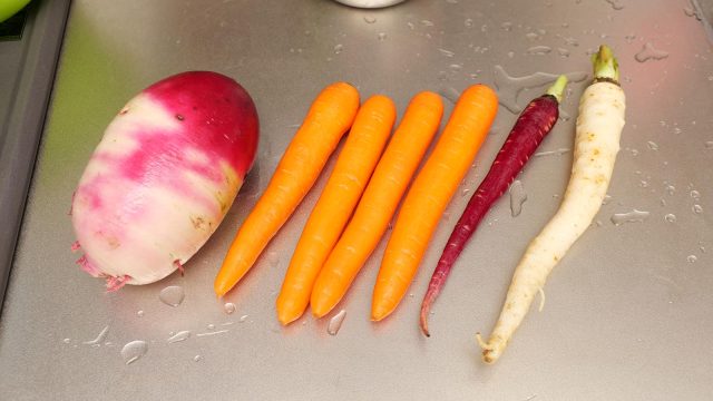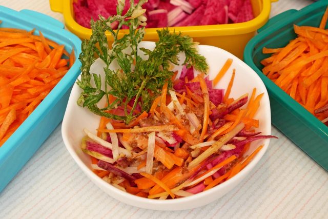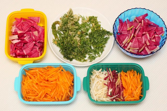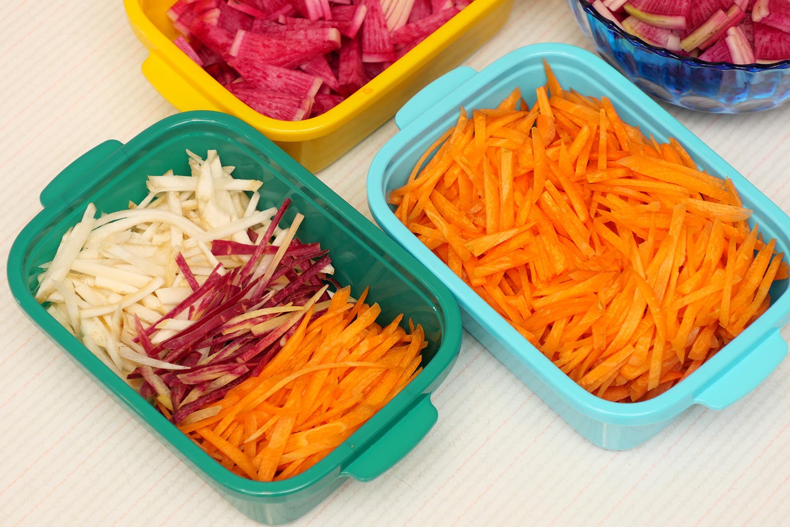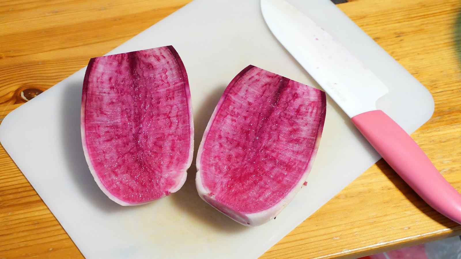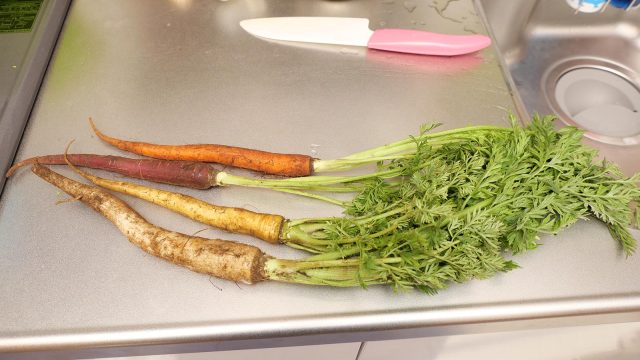 ↑野菜セットが届いた直後の休日は家族でサラダランチを楽しむのが我が家の定番行事で、今回は「カラー大根」と「にんじん」と「カラー人参」を使います(ってどれも皮を剥かずにただ切るだけですが)。