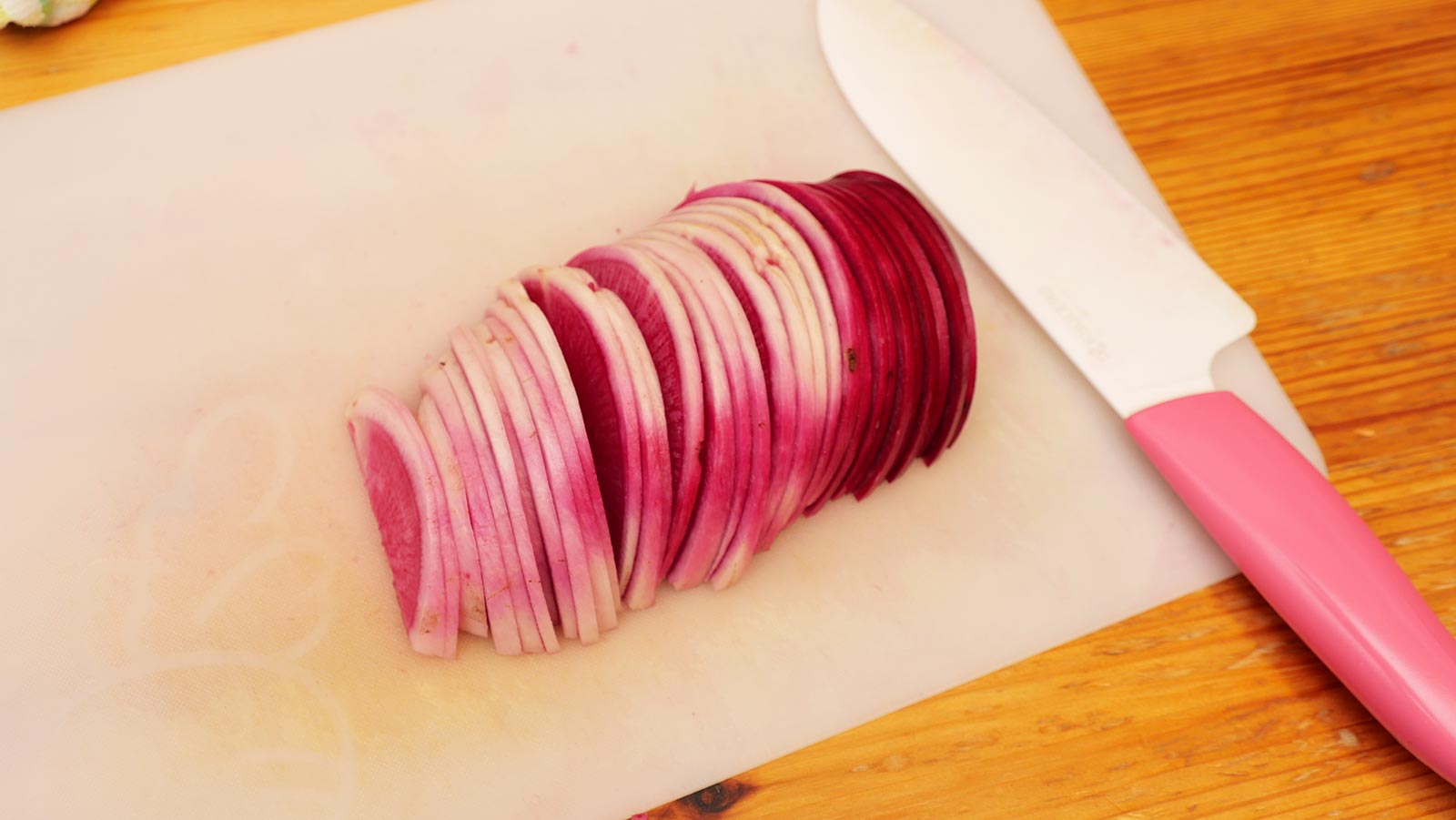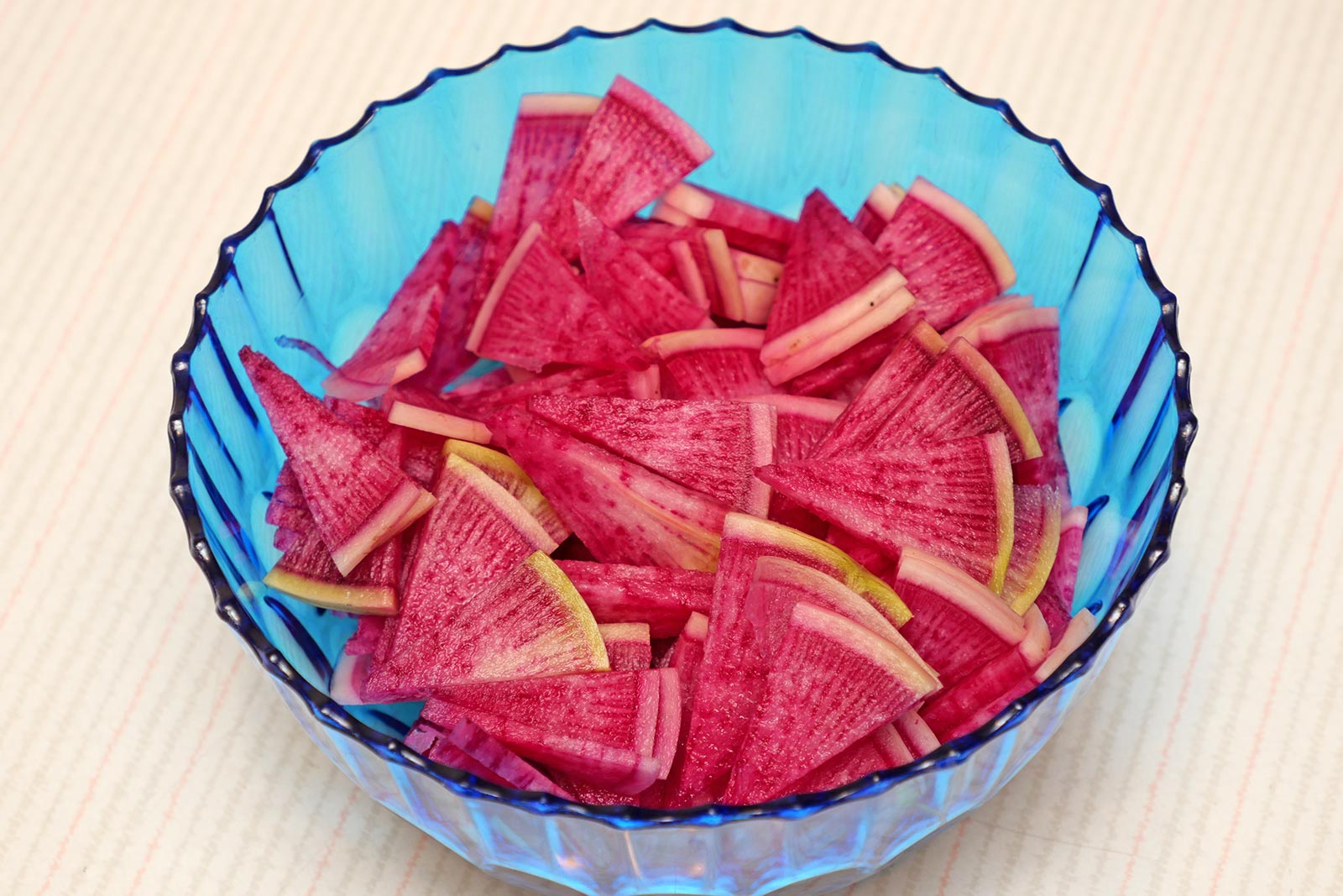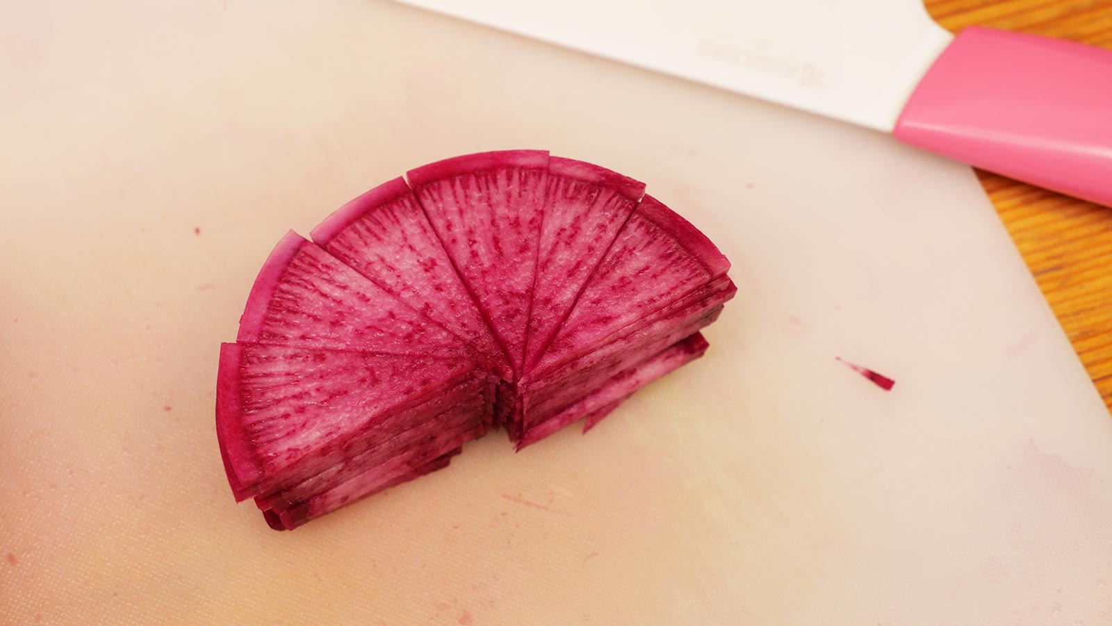 ↑野菜セットが届いた直後の休日は家族でサラダランチを楽しむのが我が家の定番行事で、今回は「カラー大根」と「にんじん」と「カラー人参」を使います(ってどれも皮を剥かずにただ切るだけですが)。
