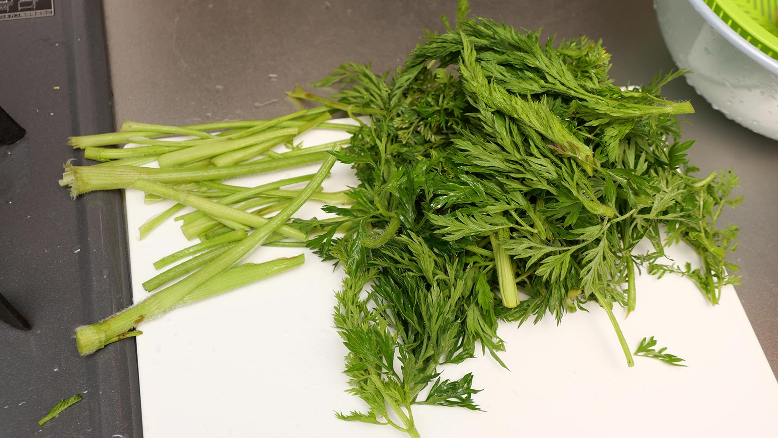 ↑茎は硬いので葉だけを手でちぎります(茎は別の料理で美味しくいただきした)。