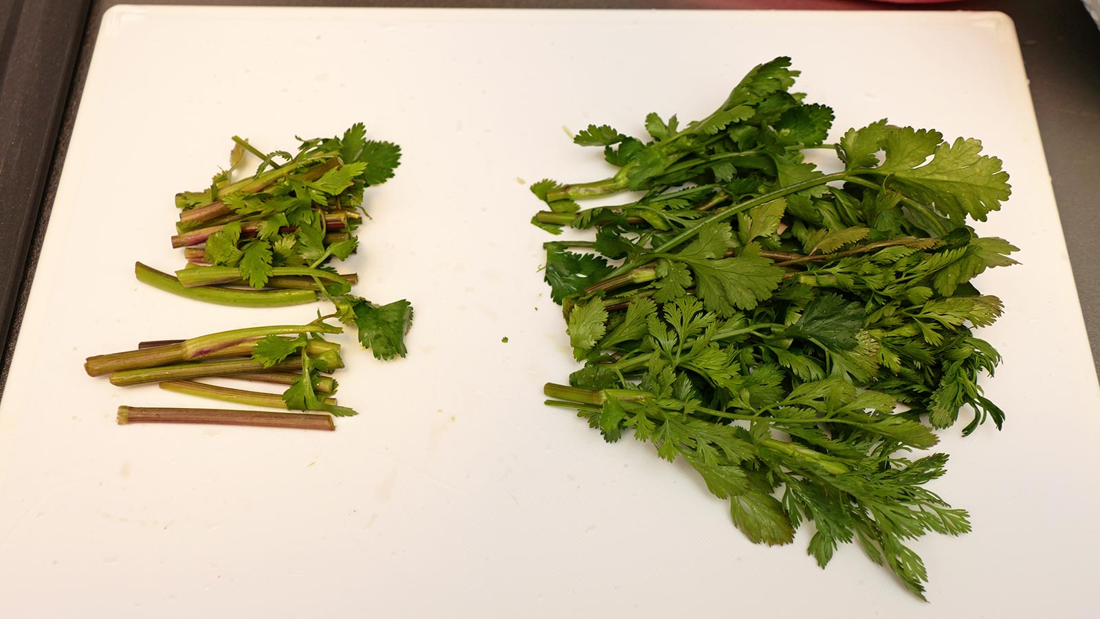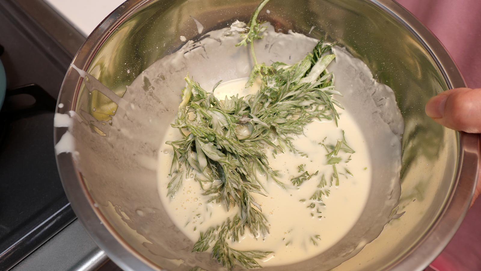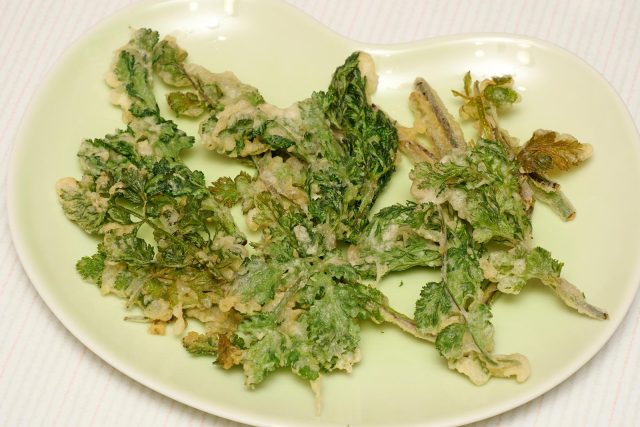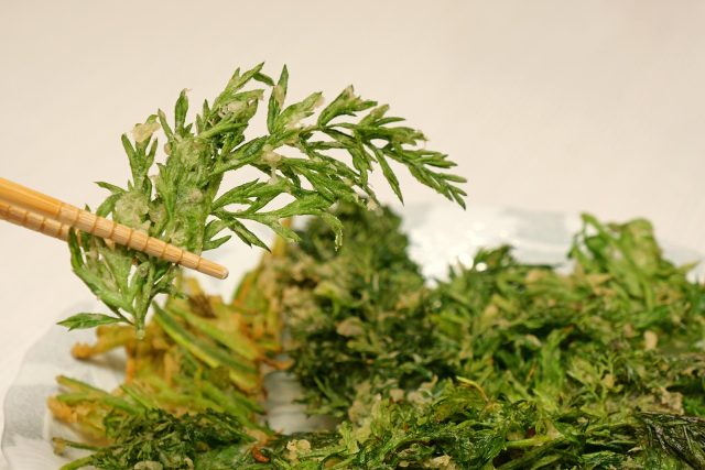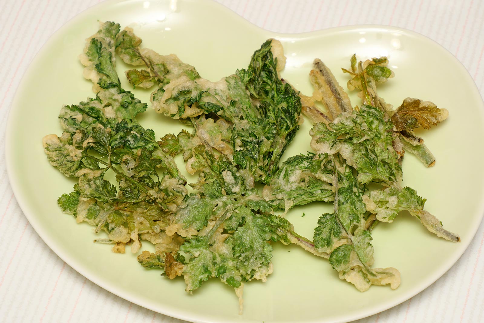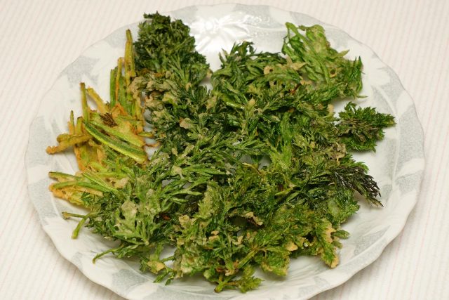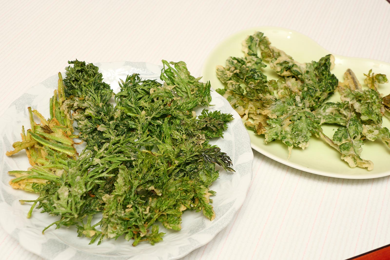 「カラー人参の葉の天ぷら」と「パクチーの天ぷら」