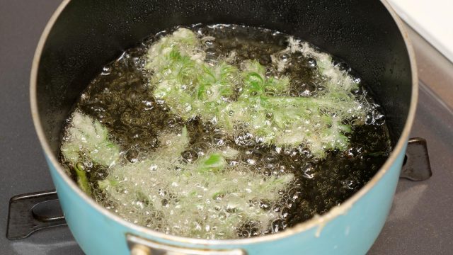 ↑茎と葉で分けます(茎の方は時間を少し長めに揚げたいので)。