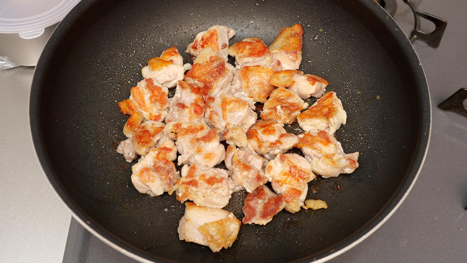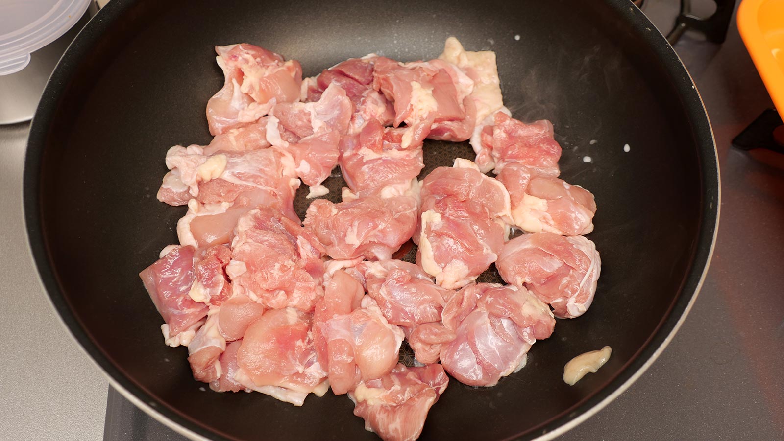 ↑鶏肉(500g)を1口サイズにカットし皮面を下にしてフライパンに並べます。皮に焼き色が付くまで4〜5分程加熱したら・・・