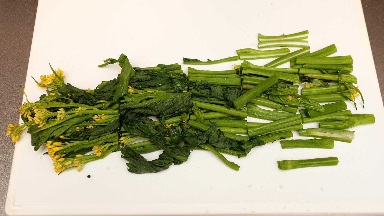 ↑高菜の菜の花の「茎」の部分だけを先に入れて30秒程加熱します(色が鮮やかになるまで)。