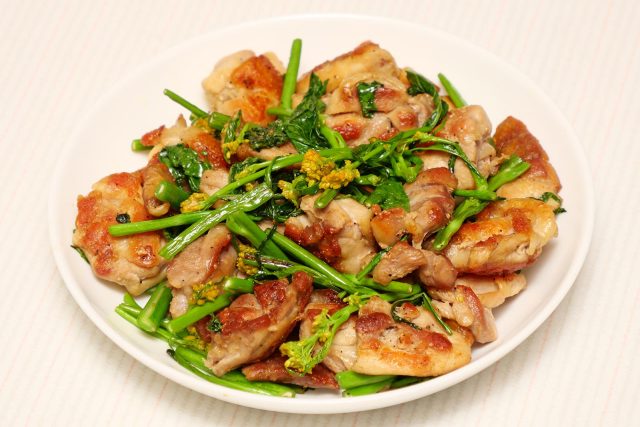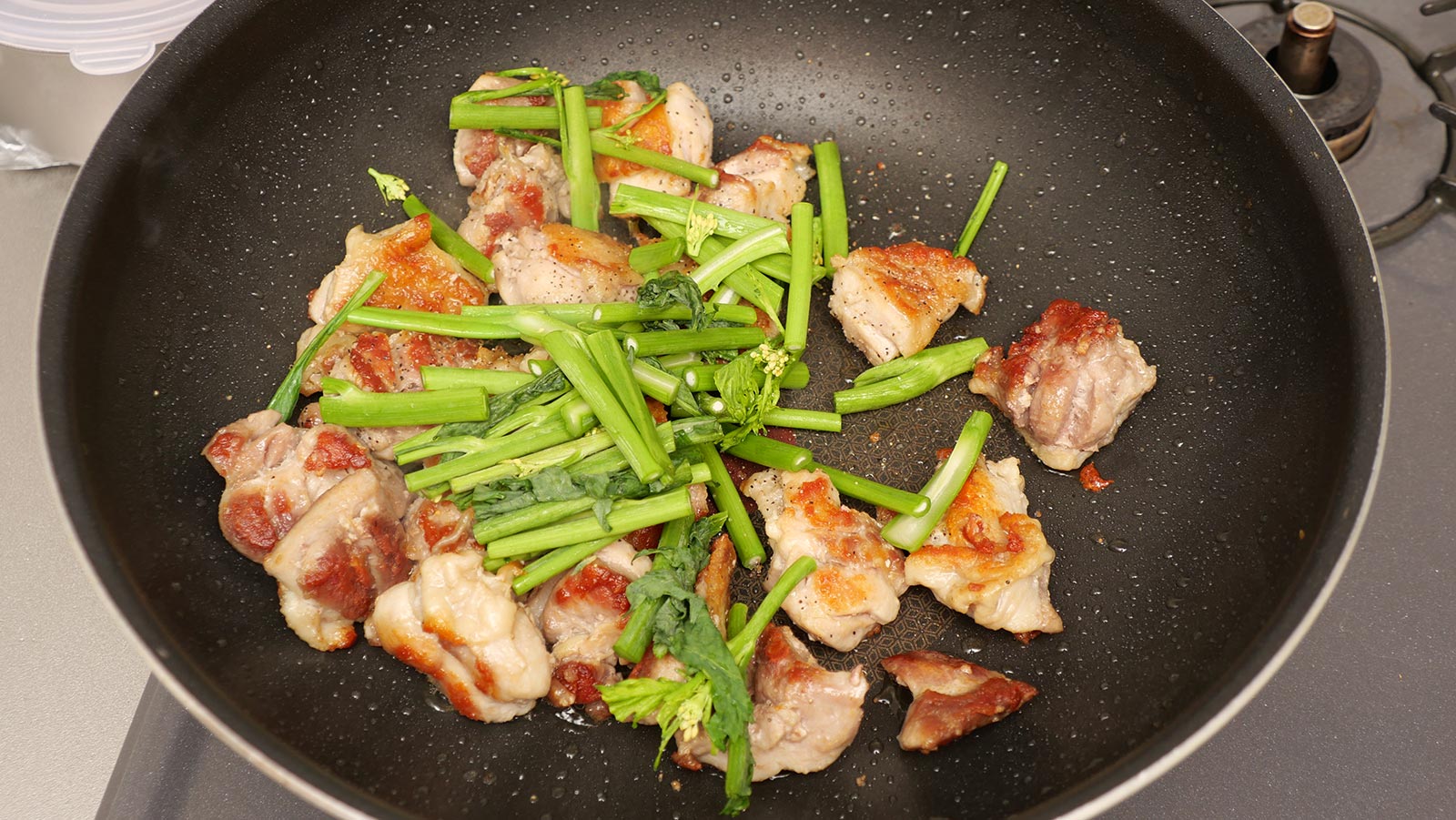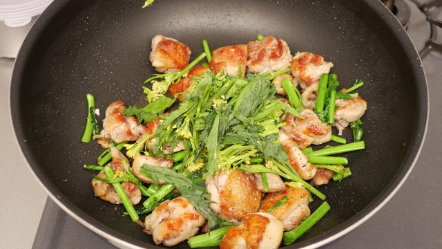 ↑「高菜の菜の花と鶏肉の炒め物」の完成です。高菜の菜の花は他の菜花よりも味も食感もしっかりしていますが、でも苦いという事もなくとても美味しいです♪