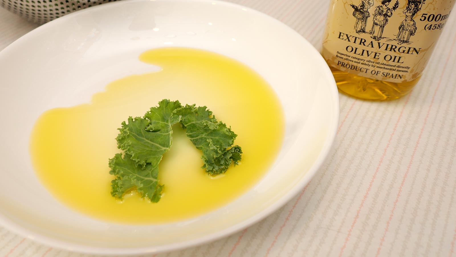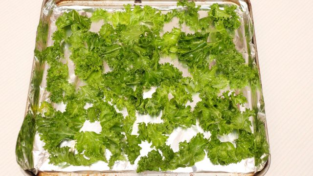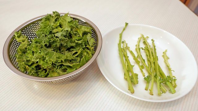 ↑お子さまのリクエストで「ケールチップス」を作ります。まずはケールを洗い、水分をなるべく拭き取ったら・・・