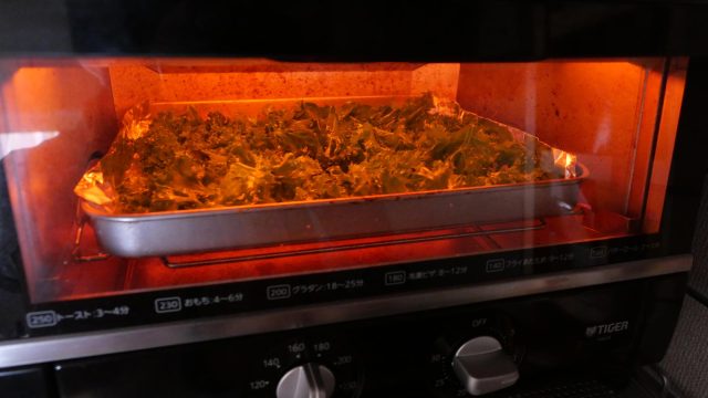 ↑予熱なしの170度のオーブン(普通のトースター)で7分程焼きます(時間が難しいのですが、焦げすぎないように見守りながら葉の一部が焦げ出したら取り出す感じです)。