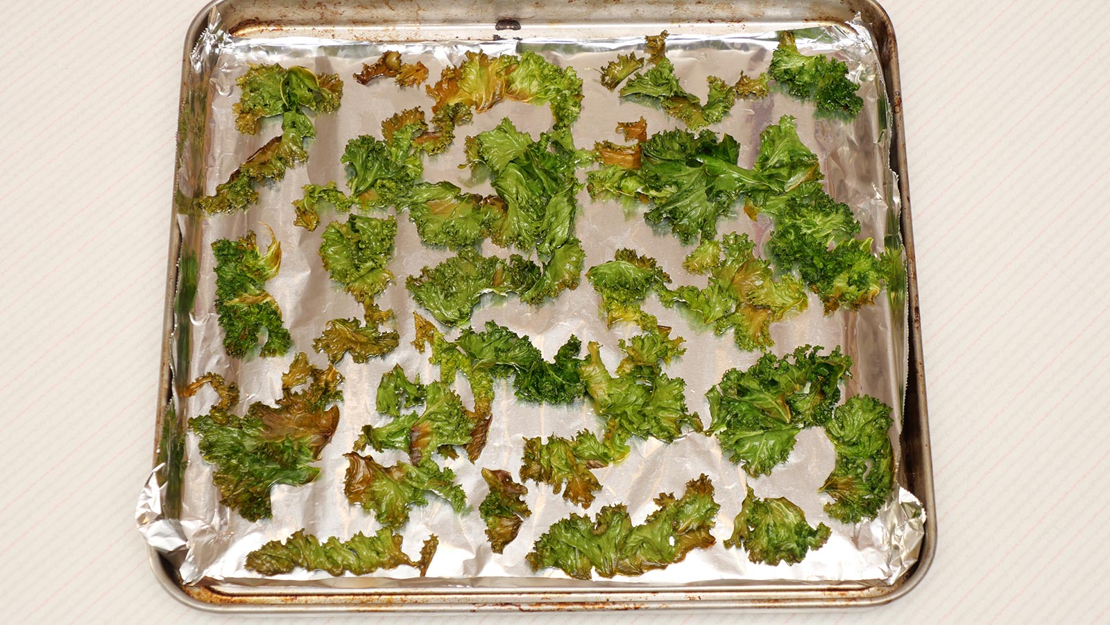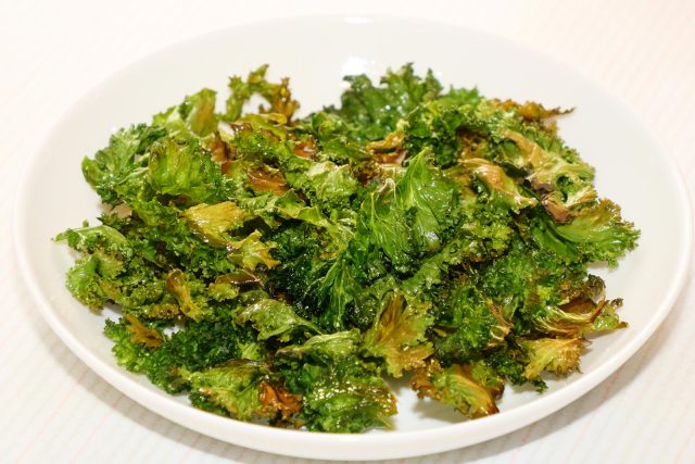 ↑軽く塩を振れば「ケールチップス」の完成です♪ケールのふりふりの葉の部分がパリパリで、生のケールが苦手なお子さまでもケールチップスにすると喜んで無限に食べてくれるので、我が家はいつもケールをおやつにしています。