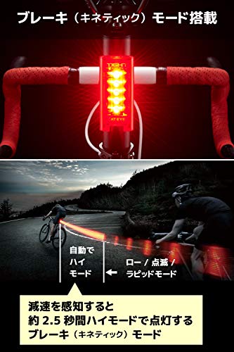 ↑通常走行時はLEDが「ロー点灯」または「点滅」しているのですが内蔵された加速度センサーによって自転車の減速(ブレーキング)を感知すると約2.5秒間LEDがハイ点灯します(クルマでブレーキを踏んだ時にブレーキランプが点灯するのと同じ感じ)。