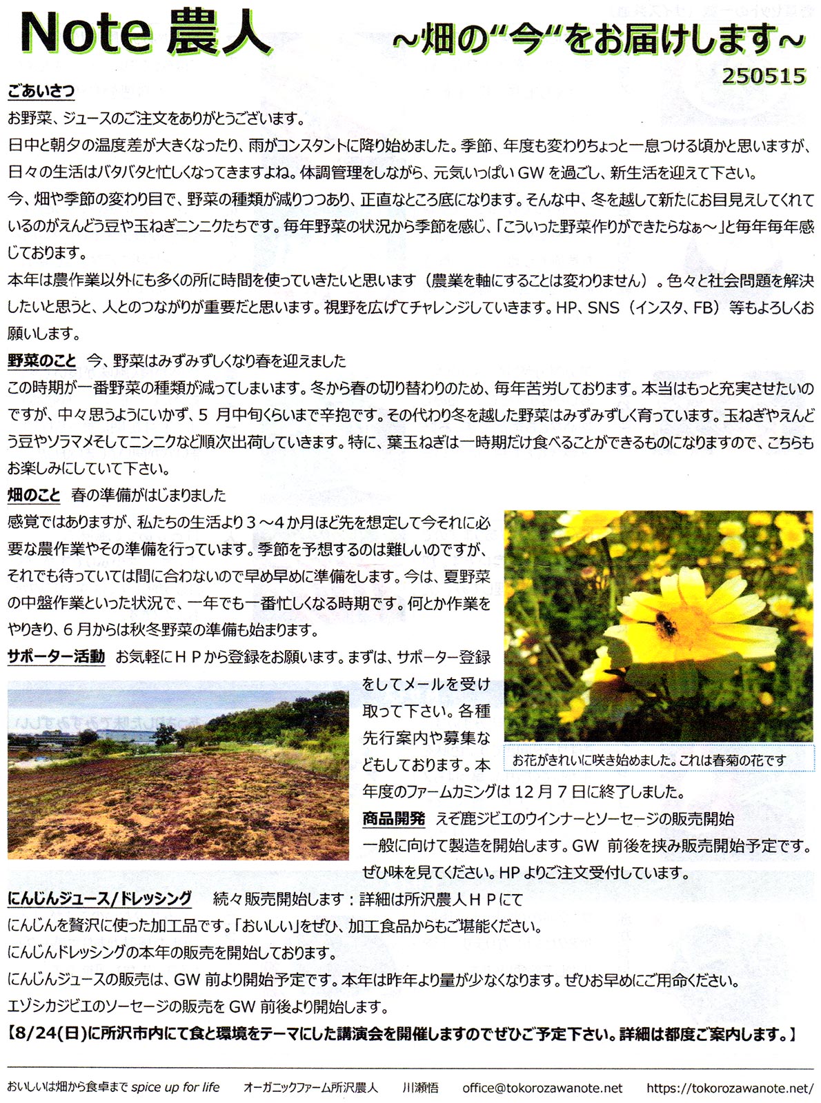 ↑今月のお便り(表面)と野菜セット一覧(裏面)。所沢ブランド認定品の「にんじんジュース」の今年度分の販売が開始されたようです。収穫量の関係で昨年度よりも全体量が少ないそうで、人気商品なので毎年楽しみにしている方はお早めにご注文くださいとのこと。