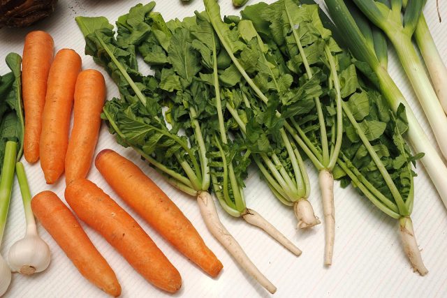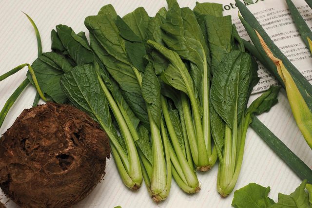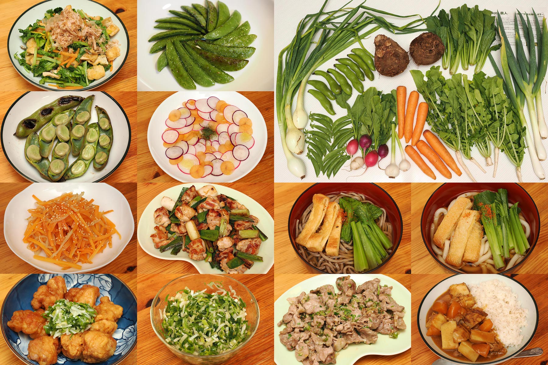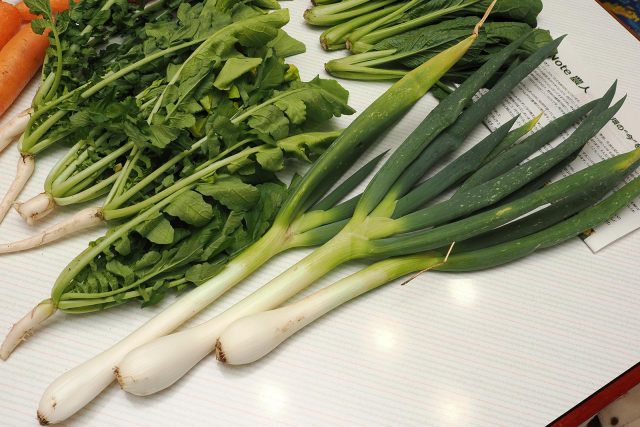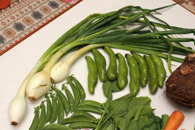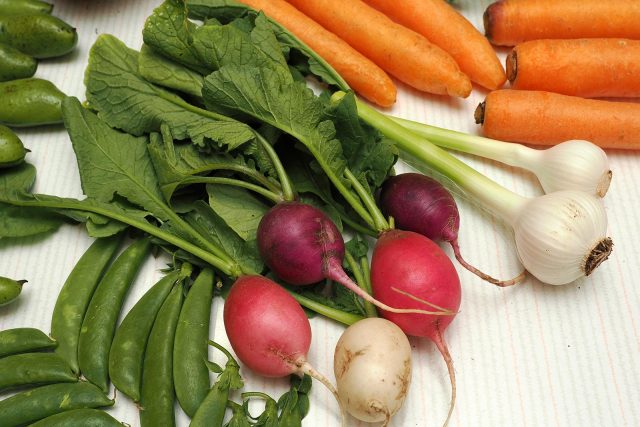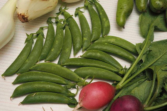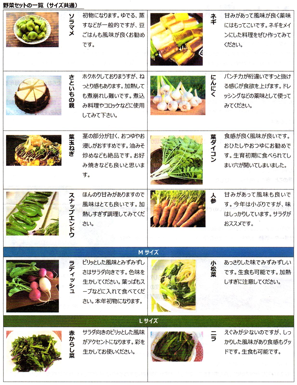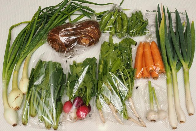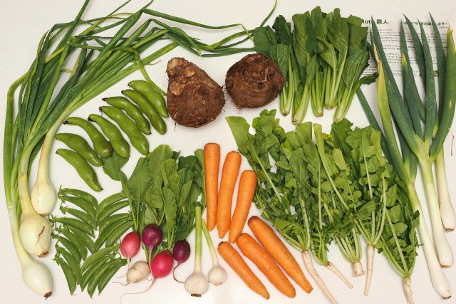 ・ソラマメ ・(長)ネギ ・さといもの親 ・にんにく ・葉玉ねぎ ・葉ダイコン ・スナップエンドウ ・人参 ・ラディッシュ ・小松菜