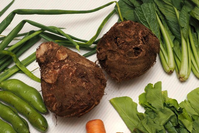 ↑今月も入っていました大きくて何かと使い勝手の良い「さといもの親(芋)」。ねっとり感があり煮崩れしにくいので、じゃがいもの代わりにカレーライスに入れても美味しいです。