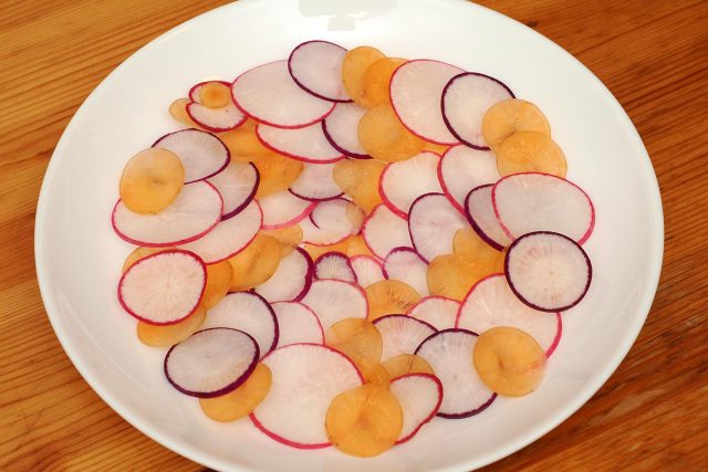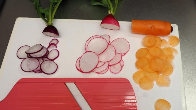 ↑スライサーを使ってそれぞれスライスします(ラディッシュの葉は汁物に入れると美味しいので捨てずに別の料理で使います)。