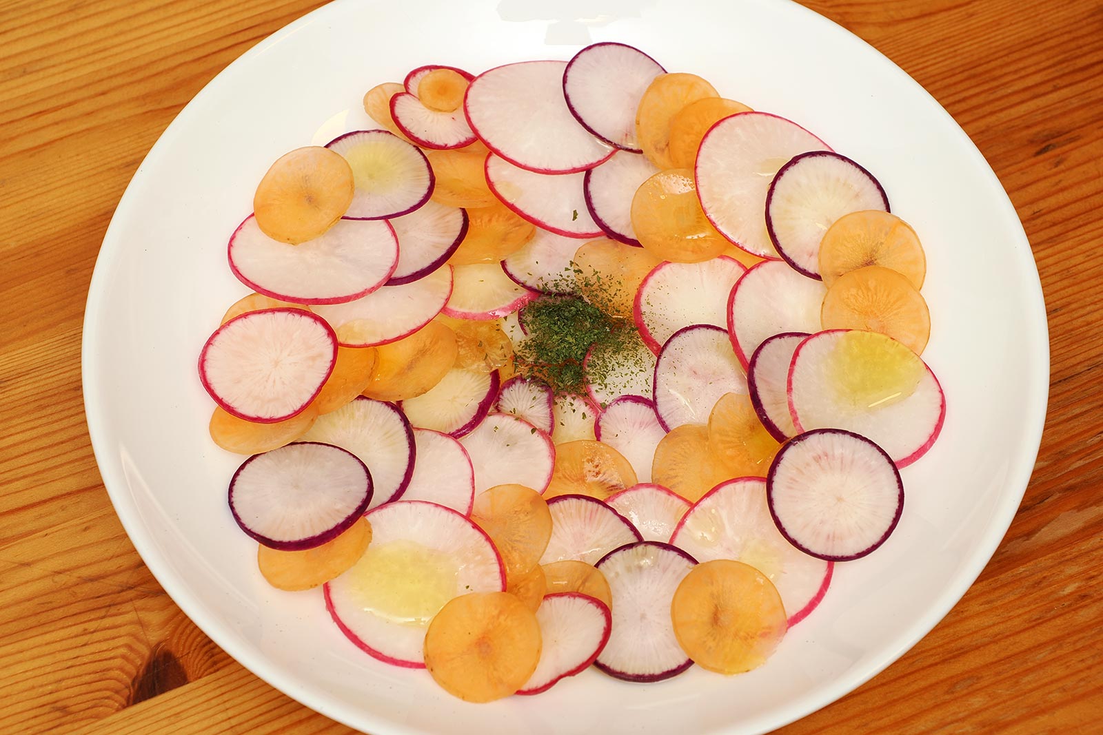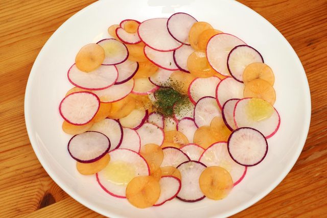 ↑オリーブオイルと塩、彩りにパセリをのせれば「ラディッシュと人参のスライスサラダ」の出来上がり。