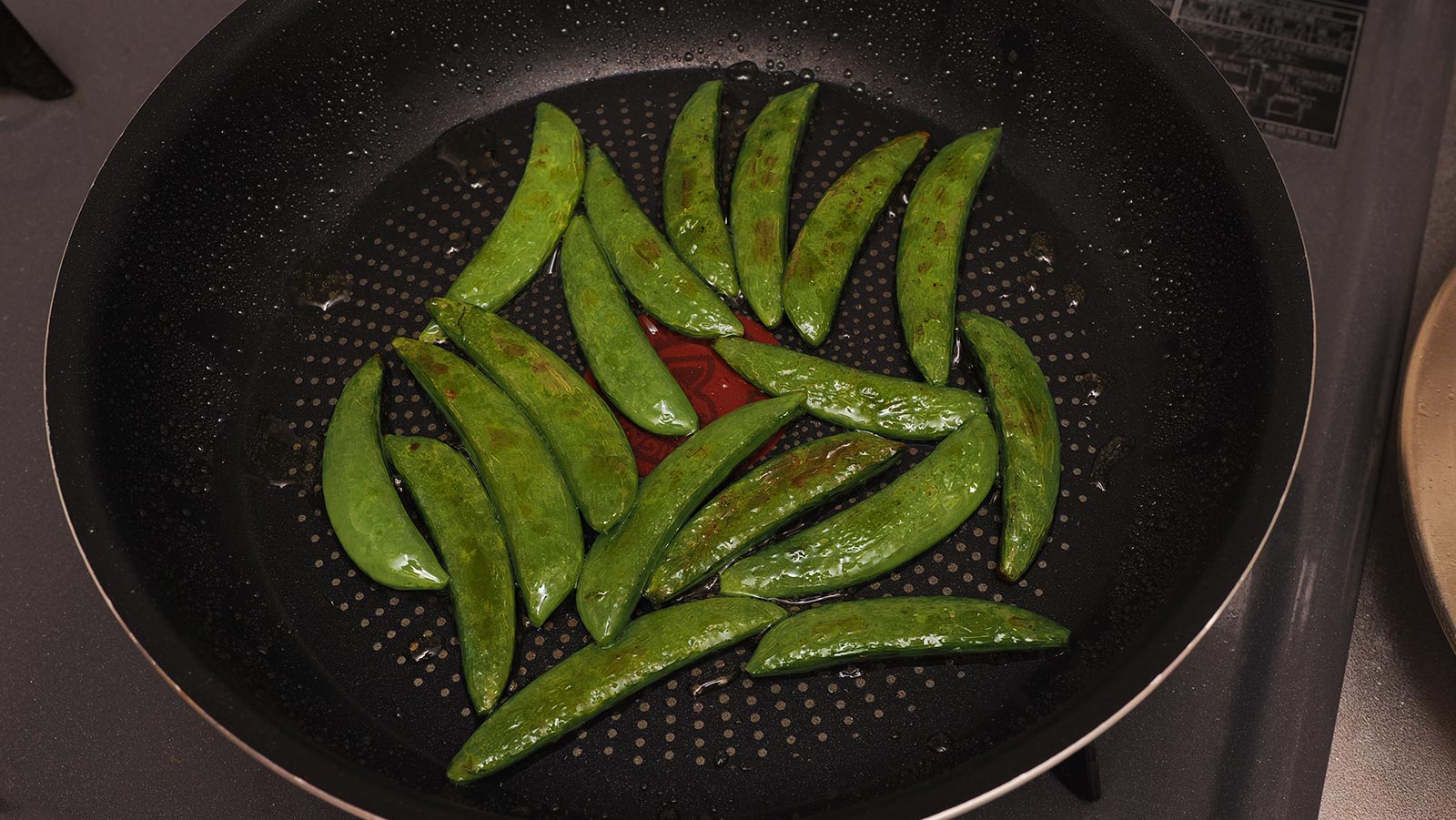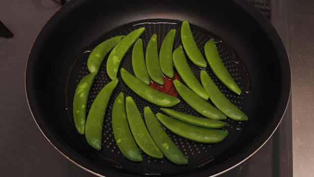 ↑フライパンにオリーブオイルを入れ、スナップエンドウを並べます(うっかりオリーブオイル入れ過ぎました・・・)。