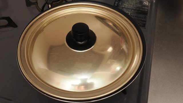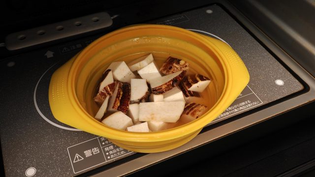 ↑その上に長ネギの上の方(中身が空洞な部分)をのせ、そのまま動かさずにしばらく加熱を続けます。