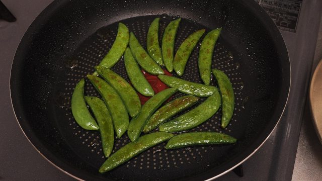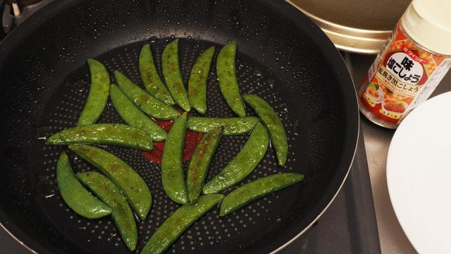 ↑2分経ったらフタを取ってスナップエンドウを裏返し、フタをせずに焼き色がつくまで2分程加熱します(オリーブオイルを入れ過ぎた為、火が通り過ぎてしまいました・・・)。