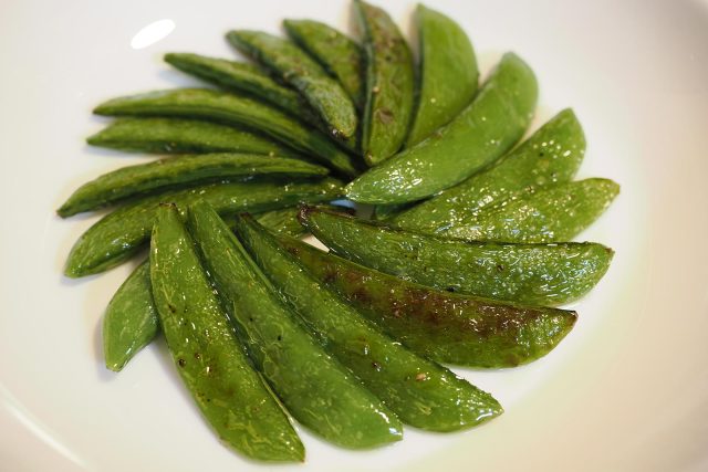 ↑「焼きスナップエンドウ」の完成。オリーブオイルを入れ過ぎて一部「焼き」というより「揚げ」っぽくなってしまいましたが、でも甘みが思っ以上に強くて(加熱の影響?)味はバッチリでした。