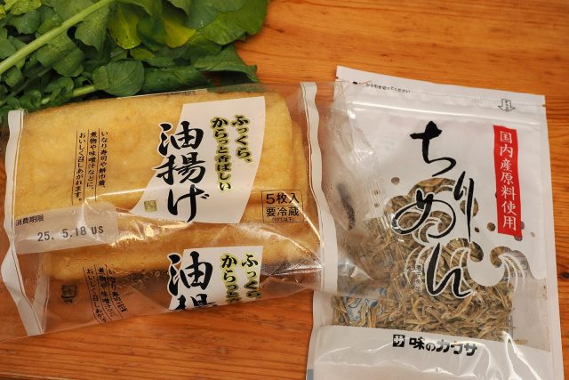 ↑油揚げと一緒に炒めてご飯のおかずにします((ちりめん)じゃこもあったので加えます)。