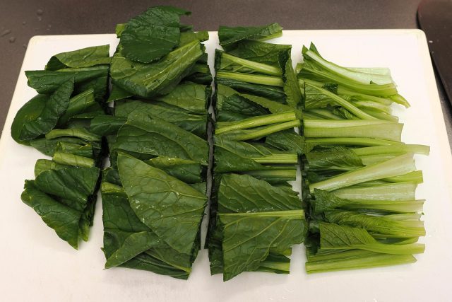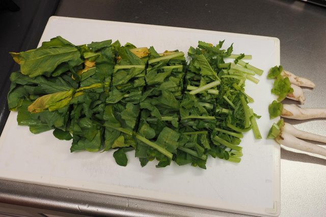 ↑葉ダイコンを食べやす大きさ(4cm程)にカットします(白い大根の部分は後でお味噌汁などに入れようと思います)。