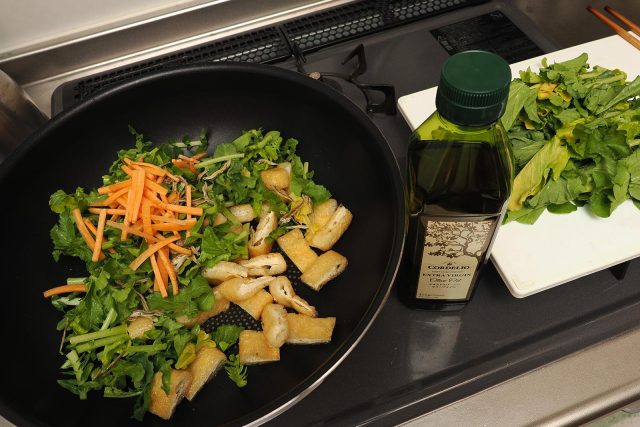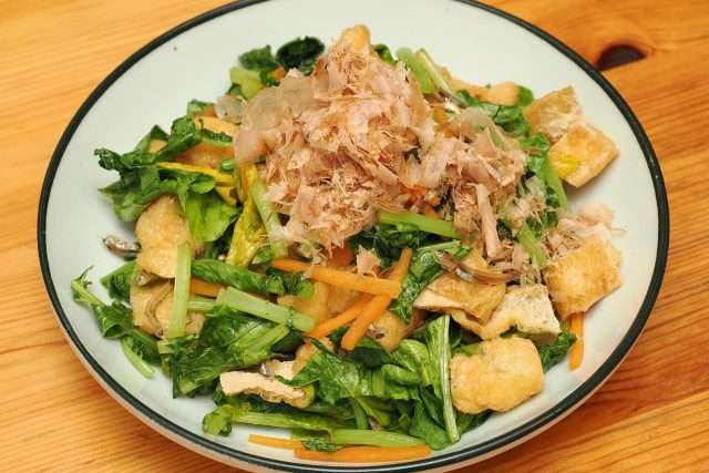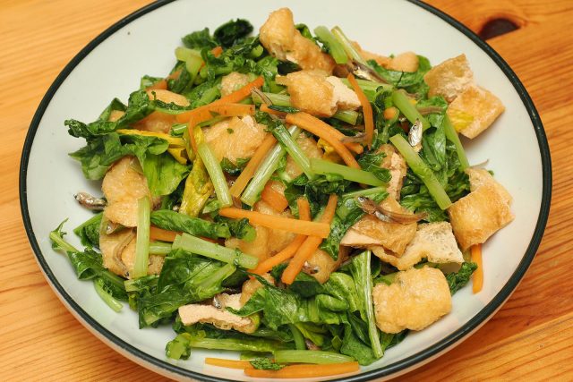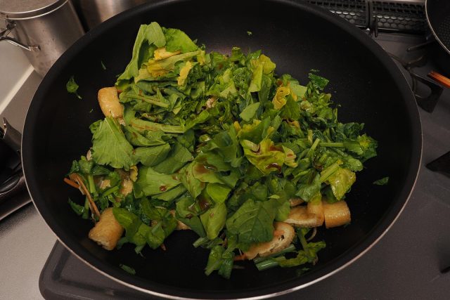 ↑ご飯のお供「葉ダイコンと油揚げの炒め物」完成です。葉大根と油揚げの最強コンビでご飯が進みます。