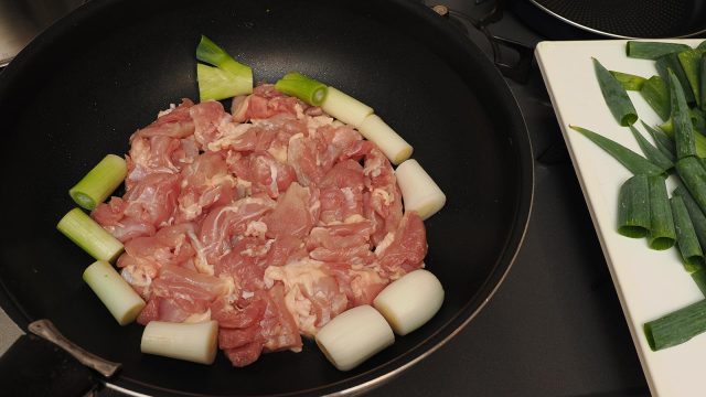 長ネギは食べやすい大きさ(4cm程)にカットし、鶏肉も1口サイズにカットしておきます。