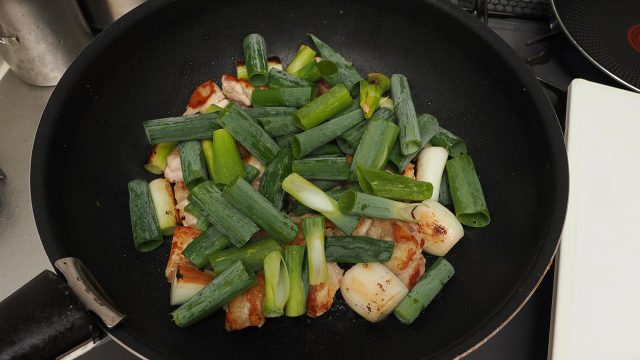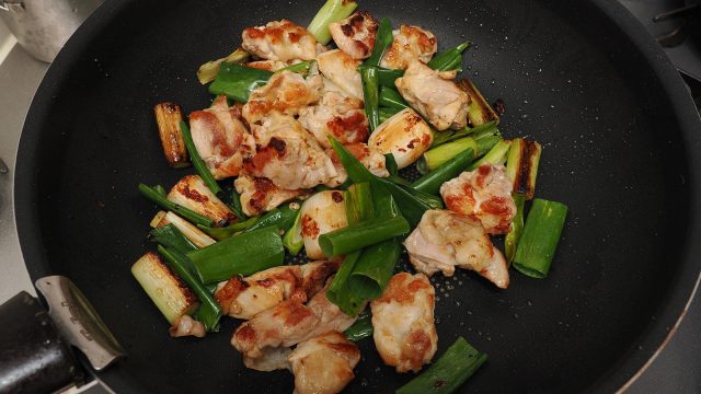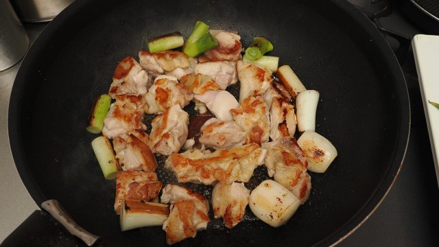 ↑皮面に十分焼き色が付くまで焼けたら、鶏肉と長ネギをひっくり返し・・・