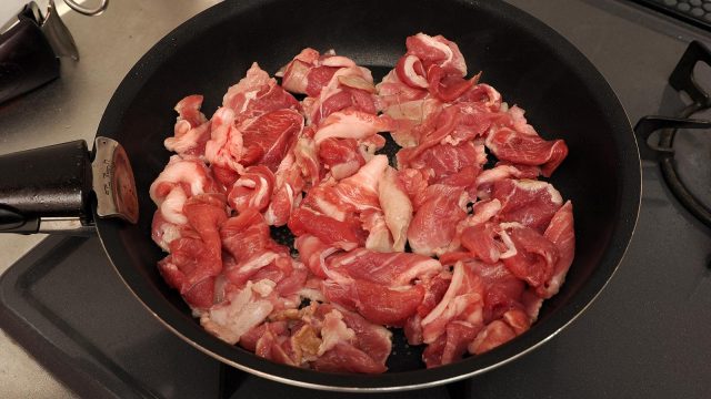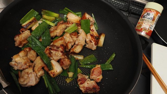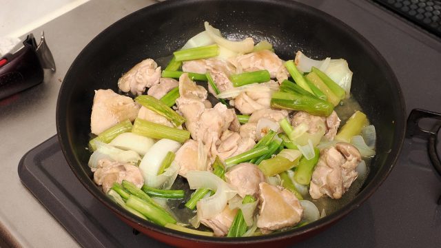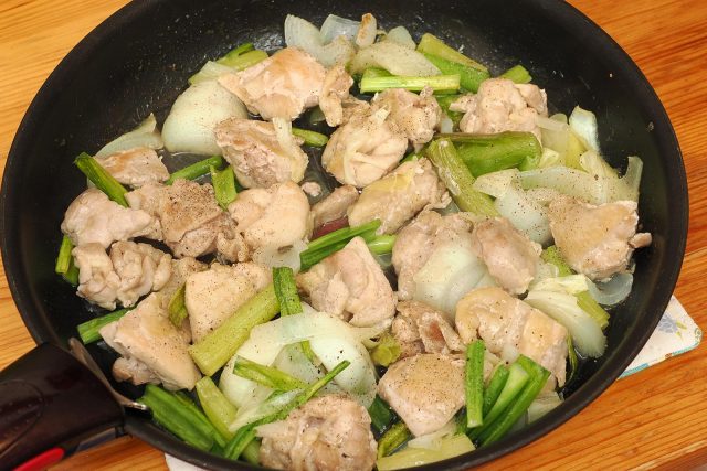 ↑フライパンに鶏肉と切った葉玉ねぎを一緒に入れてフタをして鶏肉に火が通るまで加熱するだけです(最後に塩コショウで味付け)。