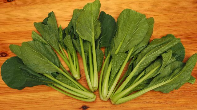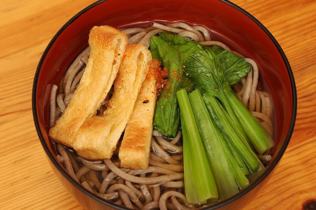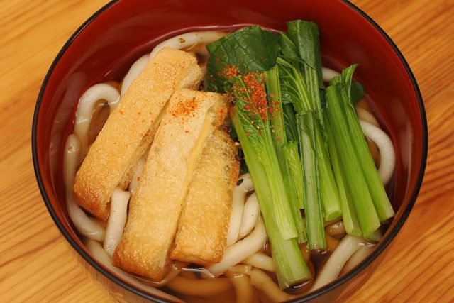 ↑うどんの上に小松菜と焼いた油揚げをのせれば「小松菜きつねうどん」の完成です。