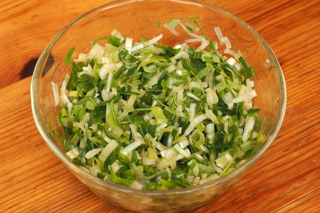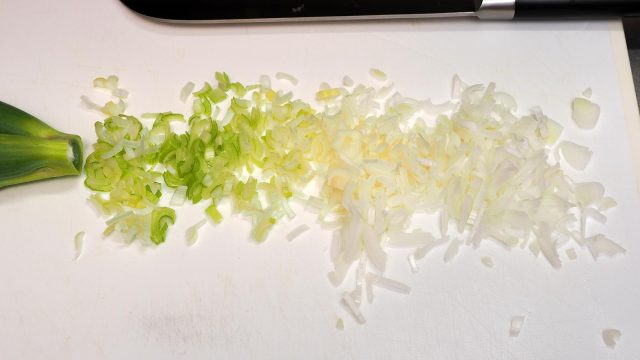 ↑切れ目を入れた後に細かく刻んでみじん切りにします(緑色の部分も同様)。