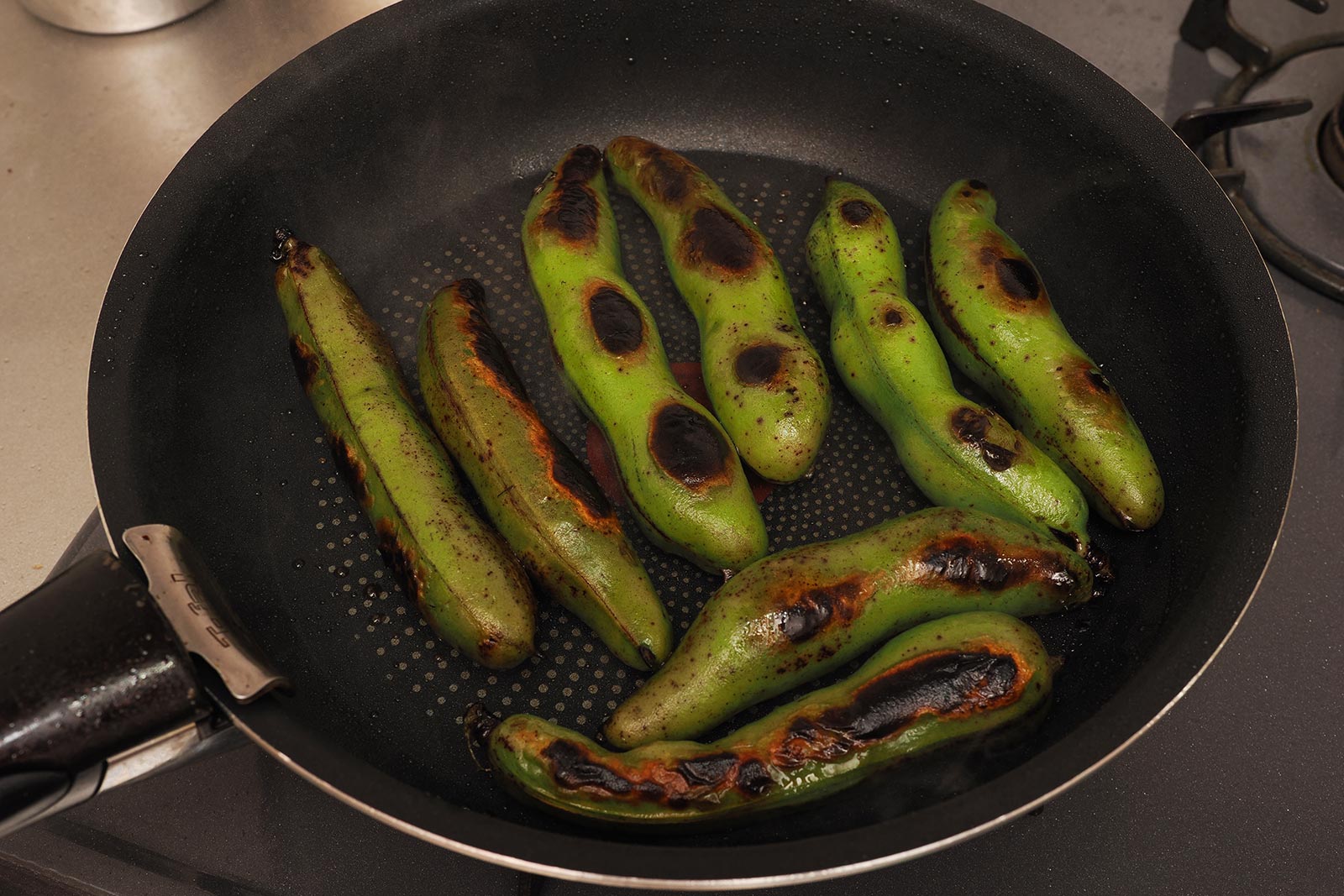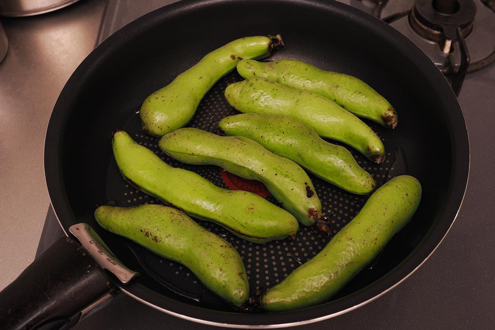 ↑フライパンにサラダ油(大さじ1)と皮付きのままのソラマメを入れ、中火でしばらく加熱します。