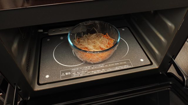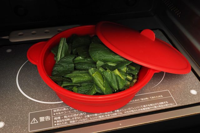 ↑シリコン容器に入れて電子レンジ(600W)で2分程加熱します(もともと生食もできるくらいなので多少かたくてもOK)。