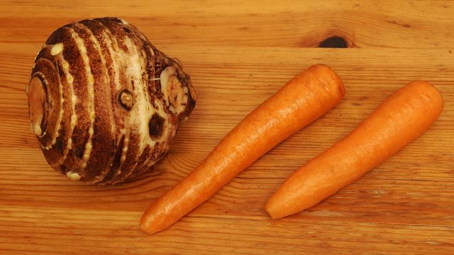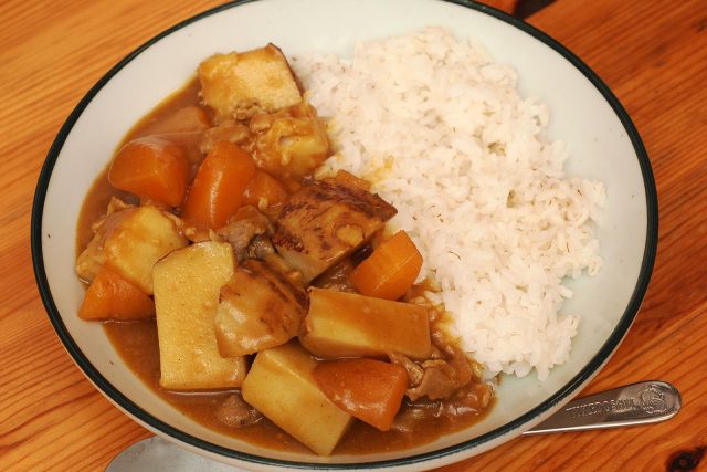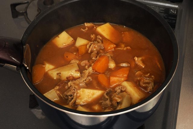 ↑「人参とさといもの親カレー」の出来上がり。カレーに入れてさといもの甘みが十分感じられますし、じゃがいもとは異なるネットリ感があり美味しいです。