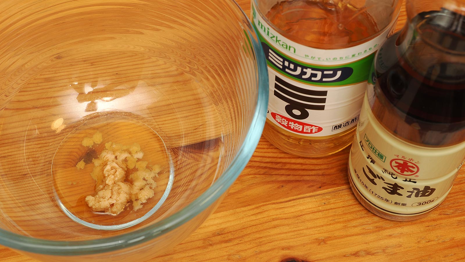 ↑ボウルに中華の元(小さじ2)、お酢(小さじ1)、ごま油(大さじ1)を加えてかき混ぜます。