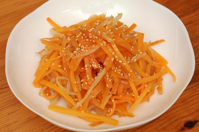 ↑最後に白ごまを振りかければ「人参ともやしのナムル」の完成です。人参はサラダで食べることが多いのですが、加熱しても安定の美味しさです。