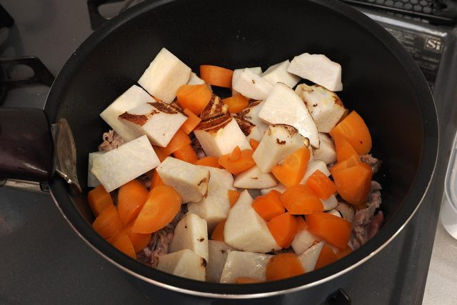 ↑お肉や人参と一緒に加熱したさといもを鍋に入れて煮込み・・・