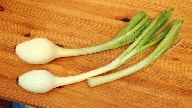 ↑この時期だけ楽しめる「葉玉ねぎ」(玉ねぎとして成長する前に収穫したもの)。通常の成長した玉ねぎよりも甘みがあり、緑色の部分も長ネギ感覚で使えます。