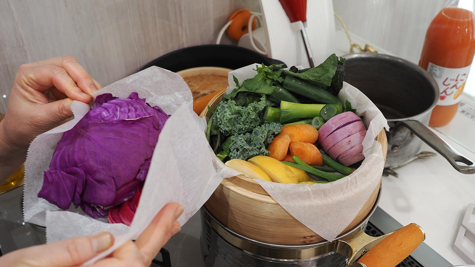 ↑彩り豊かなせいろ蒸しは濃い色の汁が出る野菜はクッキングシートで区切って蒸すように教えてくれました(せきねさんは蒸し料理は未経験なので、これを聞いていなかったら大変な事になるところでした)。